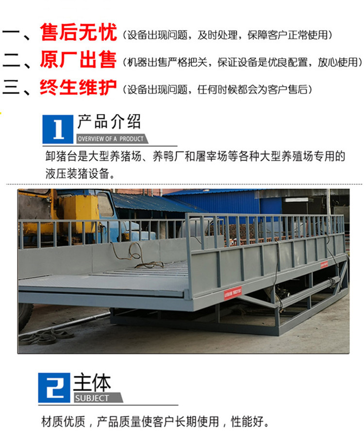 產(chǎn)品介紹:卸豬臺大型養(yǎng)豬場、養(yǎng)鴨廠和屠宰場等各種大型養(yǎng)殖場專用的液壓裝豬設備